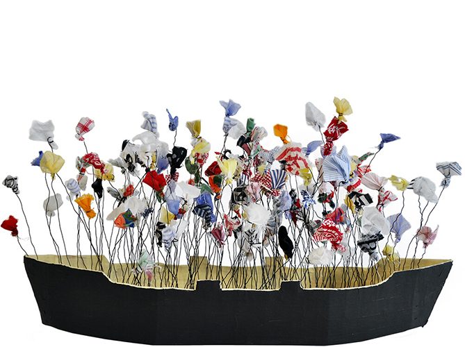 Sinkendes Schiff . 2019 . Karton, Papier, Farbe, Wurzeln . ca. 18 x 50 x 12 cm