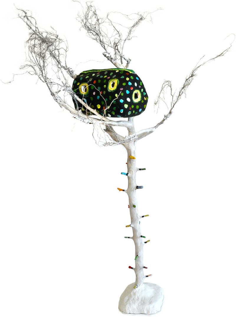 Baumhaus . 2020 . Weissdornast, Wurzeln, Draht, Papier, Farbe, Fimo . ca. 80 x 60 x 50 cm