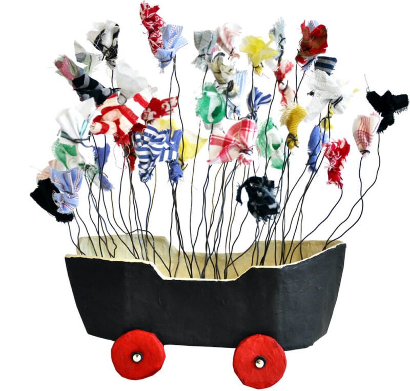 Kinderwagenschiffchen . 2021 . Karton, Malerband, Draht, Stoffresten, Farbe . ca. 22 x 20 x 22 cm
