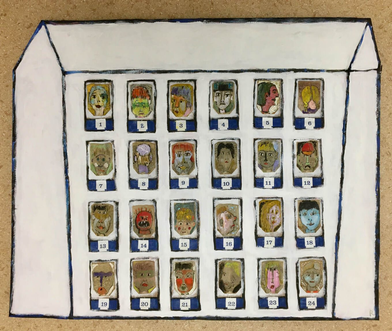 Gebeutelt (Corona) . 2021 . Karton, Getrocknete Adventskalender-Teebeutel, Tuschestift, Farbe . ca. 58 x 72 cm